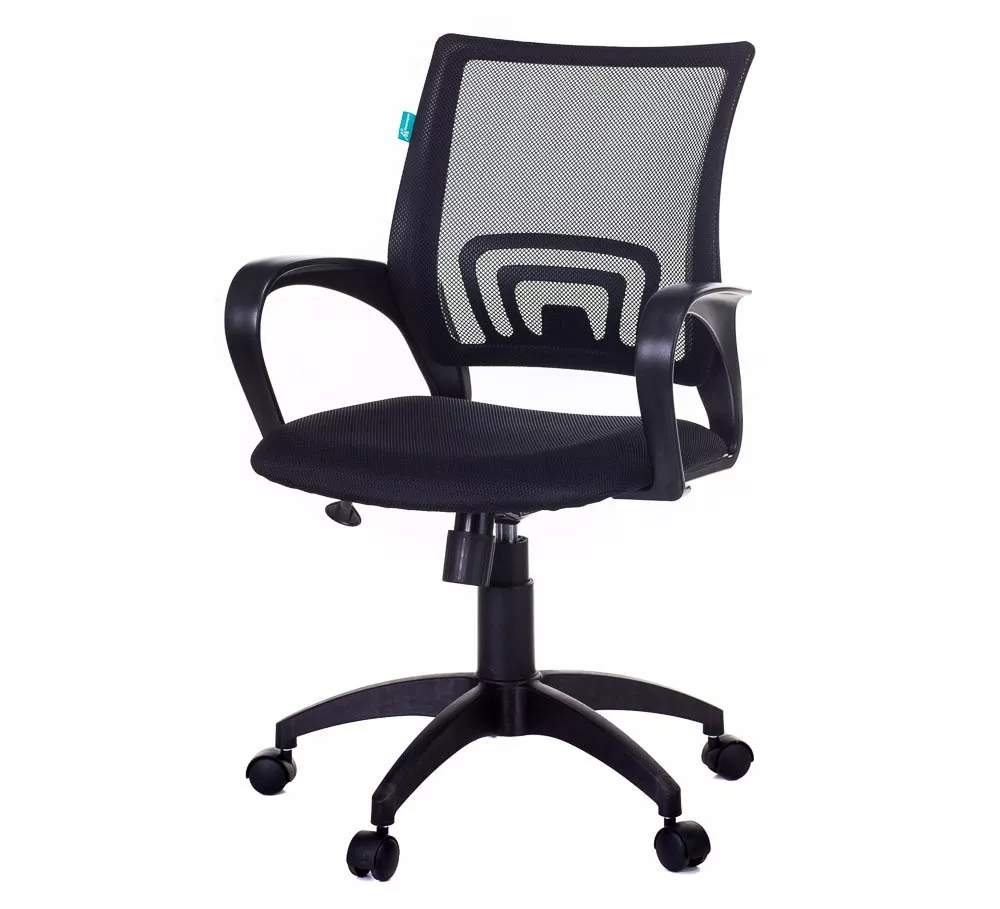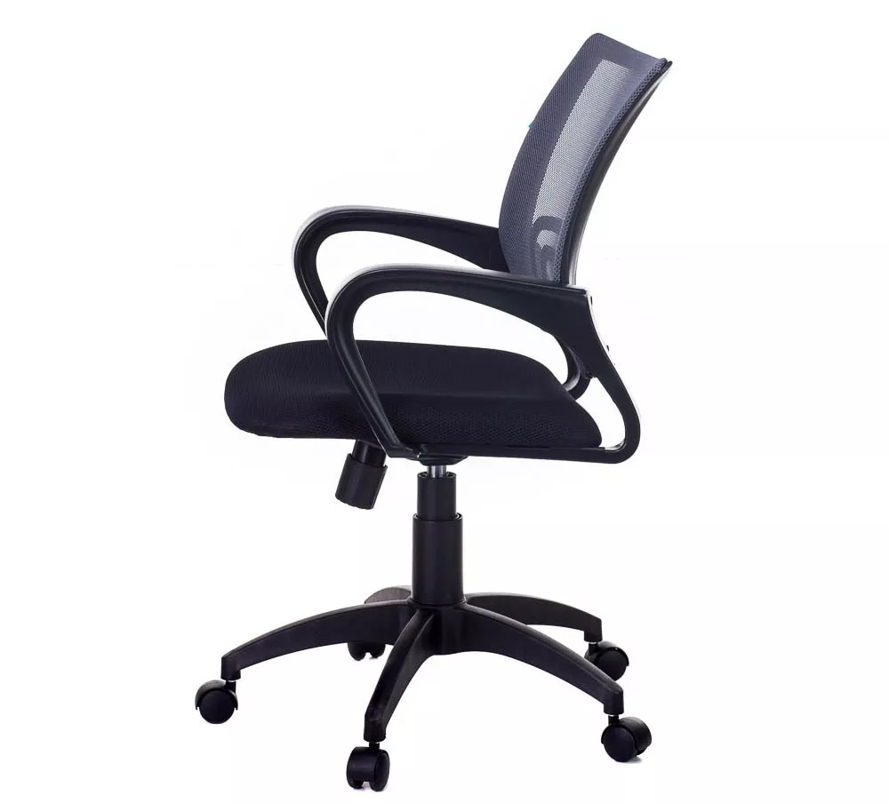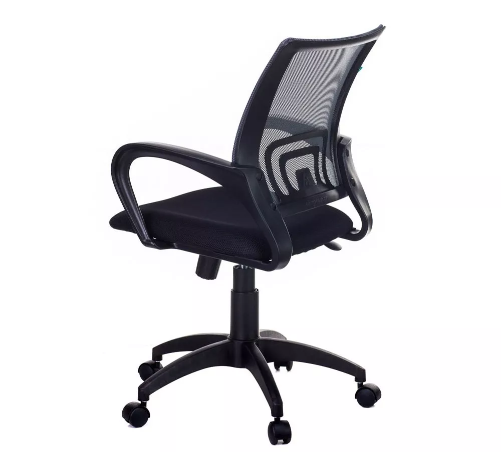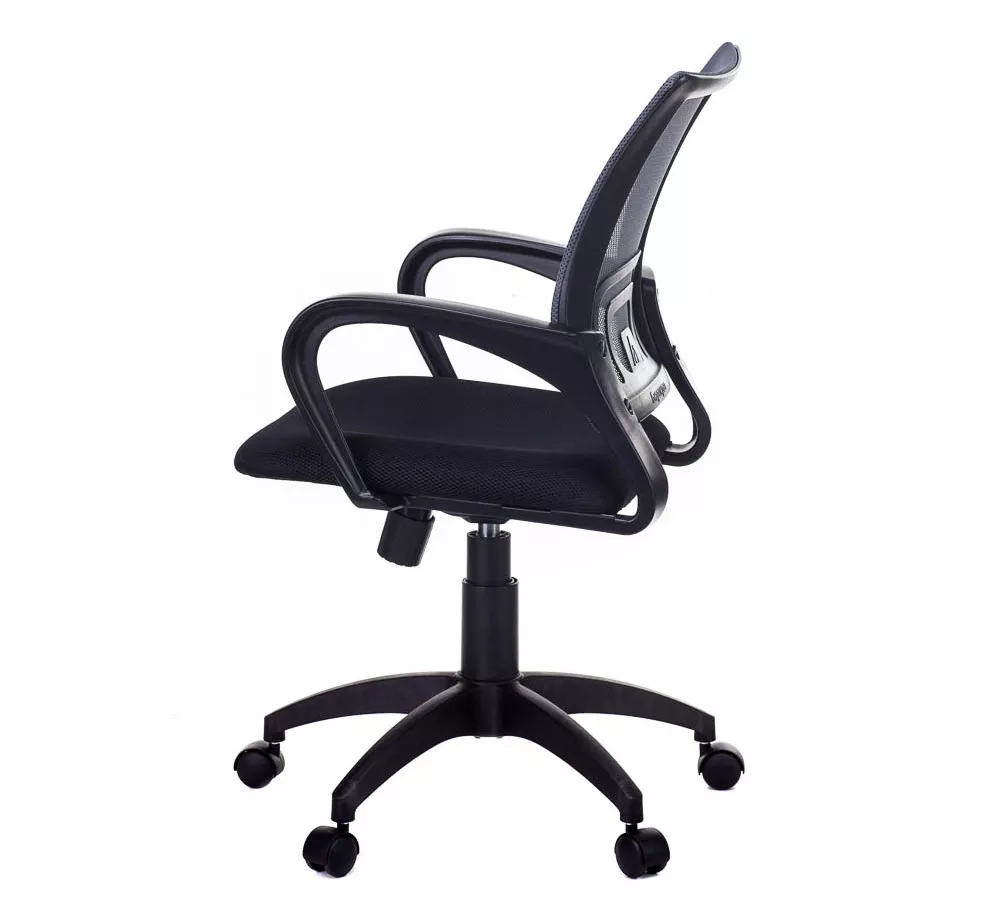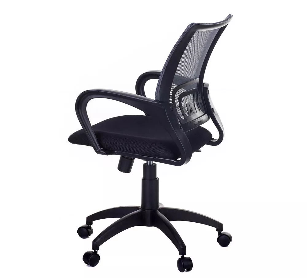 Ткань черного цвета, которой обтянуто сидение кресла, отличается своей прочностью и износостойкостью. Предусмотрен механизм качания. Пятилучевая крестовина изготовлена из прочного пластика. В сочетании с поворотными колесиками, она позволяет креслу легко и бесшумно передвигаться по любому напольному покрытию. Ограничения - вес более 120 кг.